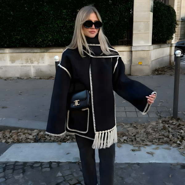 Mit seinem lässigen, leicht oversized Schnitt und dem integrierten Schal mit Fransen ist er ein Fashion-Statement, das dich nicht nur warm hält, sondern dich auch auffällig stylisch aussehen lässt.